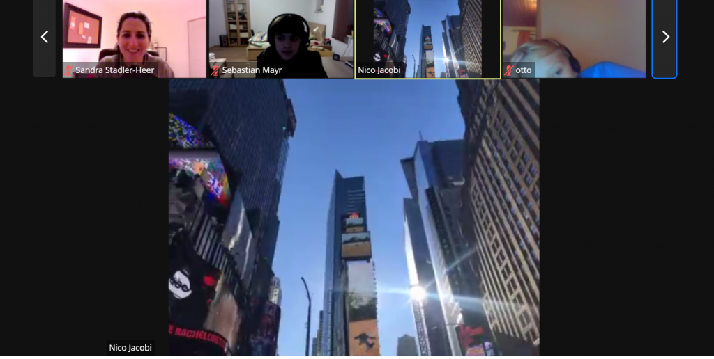 Der Englischlehrer Nico Jacobi lebt in New York und unterrichtet an der Online Privatschule mit der Lernsoftware BRAINIX, mit der die Schülerinnen und Schüler interaktiv die englische Sprache lernen und die englischsprachige Welt erkunden (siehe dazu auch die Pressemitteilung zur Online-Schule). Ausgangspunkt zum Kennenlernen der USA ist die Grand Central Station in New York City. Von dort nahm Jacobi die per Videokonferenz zugeschalteten Kinder der Online-Schule sowie der sechsten Klassen des Willibald-Gymnasiums und des Gymnasiums Beilngries per Handykamera mit auf den Time Square und zeigte ihnen optisch und akustisch die Stadt an einem sonnigen Mittag im November. Die Schülerinnen und Schüler fragten mit den gerade in BRAINIX gelernten Adjektiven und Steigerungsformen nach dem „tallest building“ oder – beim Gang durch einen Laden – nach den „best sweets“, die ihr Lehrer besonders empfehlen würde. Per Handykamera und Dialog lernten sie aus erster Hand das Lebensgefühl in der Millionenmetropole kennen.