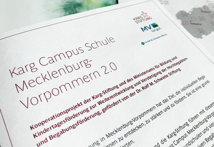 Vor vier Jahren starteten die Karg-Stiftung und das Bildungsministerium das Projekt Karg Campus Schule Mecklenburg-Vorpommern. In diesem wurden erfolgreich Schulleitungen und Lehrkräfte von vier Grundschulen und vier Gymnasien in der Begabungs- und Begabten-förderung qualifiziert und miteinander vernetzt. Jetzt wird im Folgeprojekt Karg Campus Mecklenburg-Vorpommern 2.0 das Netzwerk erweitert und das erworbene Wissen in andere Schulen transferiert. Mecklenburg-Vorpommern baut damit seine verlässlichen Strukturen für ein begabungsgerechtes Bildungssystem weiter aus und bietet so allen Schülerinnen und Schülern die Chance, ihre Potenziale zu entwickeln. Gefördert wird das Projekt von der Dr. Rolf M. Schwiete Stiftung mit einem Drittel der Kosten.