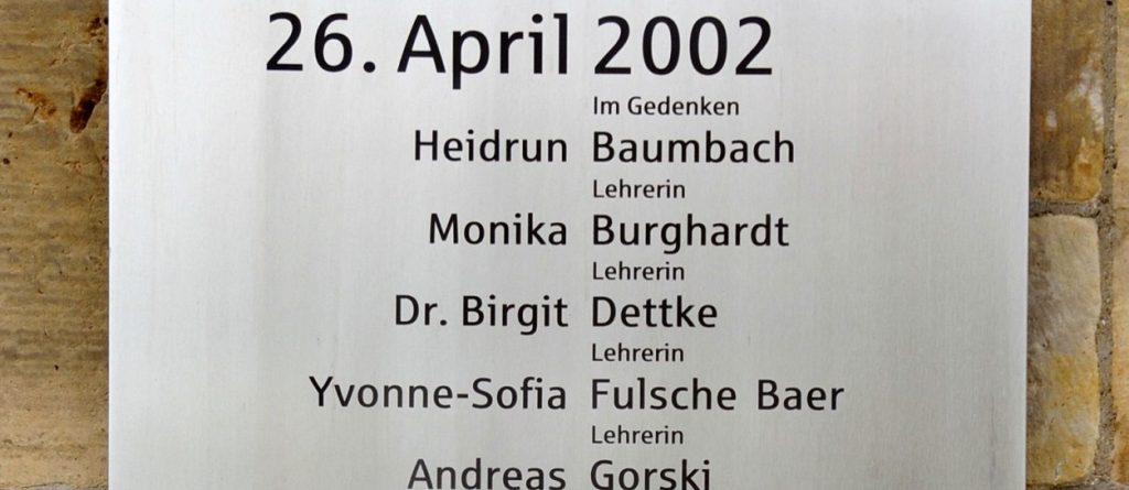 Am 26. April 2002 tötete ein Ex-Schüler am Gutenberg-Gymnasium 16 Menschen. Der 19-Jährige erschoss zwölf Lehrkräfte, eine Schülerin und einen Schüler, eine Sekretärin, einen Polizisten und letztlich sich selbst. Es war das erste Schulmassaker eines solchen Ausmaßes an einer deutschen Schule. Zuvor waren Massaker mit Schusswaffen ein Phänomen, das man in Deutschland aus den USA kannte, etwa von der Columbine High School in Littleton (1999). News4teachers