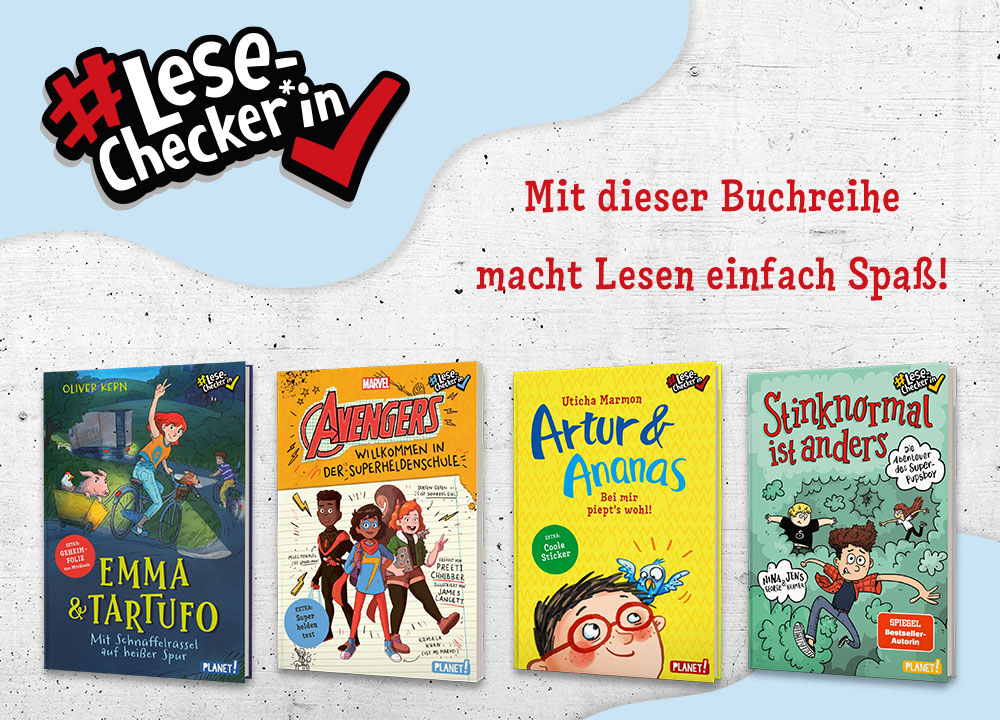 Unter dem Label #LeseChecker*in erschienen bei PLANET! in diesem Frühjahr die ersten vier Bände einer Buchreihe, die auf Leseabenteuer setzt und im Rahmen der Leseförderung zugleich jene Mädchen und Jungs einbezieht, die sich mit dem Selberlesen schwertun. Das Geschichtenerzählen mit seinen bestimmenden Ingredienzien – Unterhaltung, Spannung, Humor – bleibt oberste Priorität, denn Lesen soll ein Vergnügen sein, egal wie gut man es schon kann.