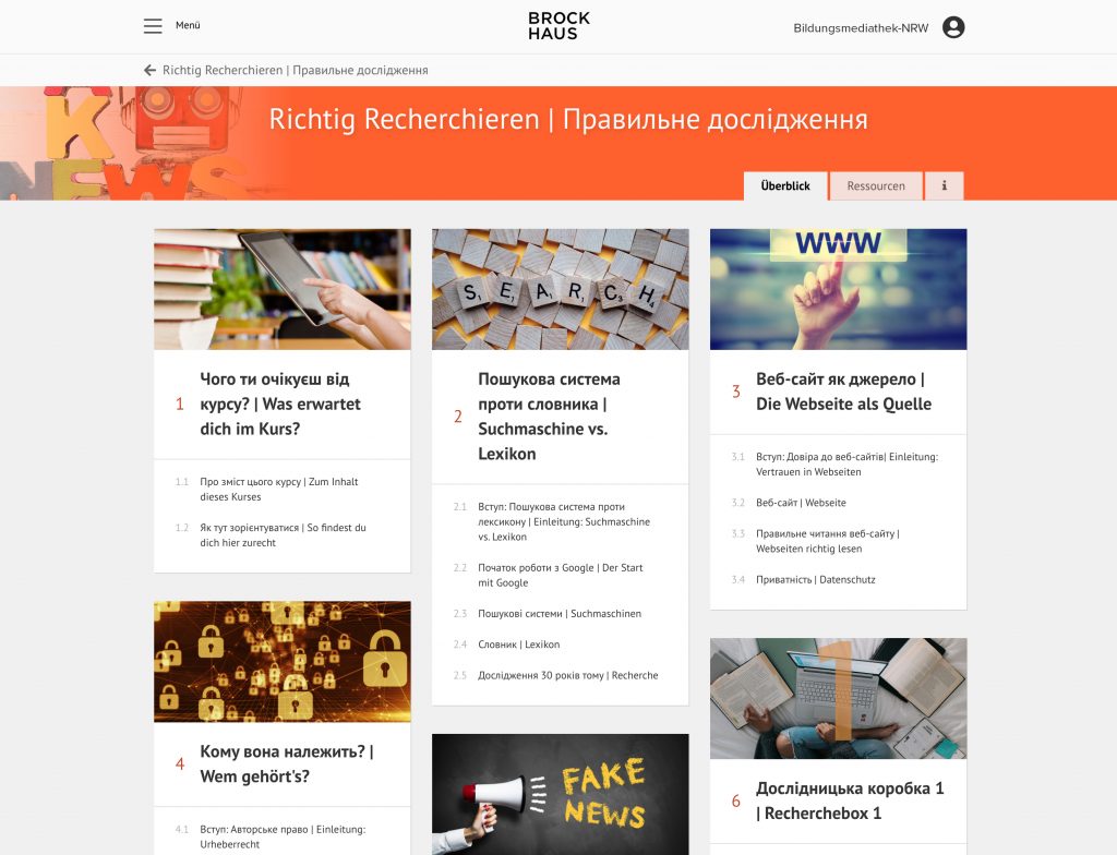 Das ukrainischsprachige Lernangebot von Brockhaus umfasst die Medienkompetenzkurse “Entdeckerbox – Recherchieren in der Grundschule” und den Online-Kurs “Richtig Recherchieren”. Während sich die “Entdeckerbox” an Schüler:innen der Jahrgangsstufen drei und vier richtet, ist der modulare Online-Kurs “Richtig Recherchieren” für die Sekundarstufe I ausgelegt. Beide Kurse können von Lehrer:innen flexibel in den Unterricht integriert werden. Durch das Zusammenspiel von altersgerechten Erklärungen und praktischen Erprobungen können Schüler:innen damit aber auch sehr selbstständig das richtige Recherchieren erlernen. Die digitalen Nachschlagewerke von Brockhaus – die Enzyklopädie und das Jugend- und Kinderlexikon – sind dabei zentrale Recherche-Instrumente und stellen eine sichere Umgebung für die erste Suche nach Informationen dar. Beide Wissensdatenbanken sind über den plastischen Reader in ukrainischer Übersetzung verfügbar.
