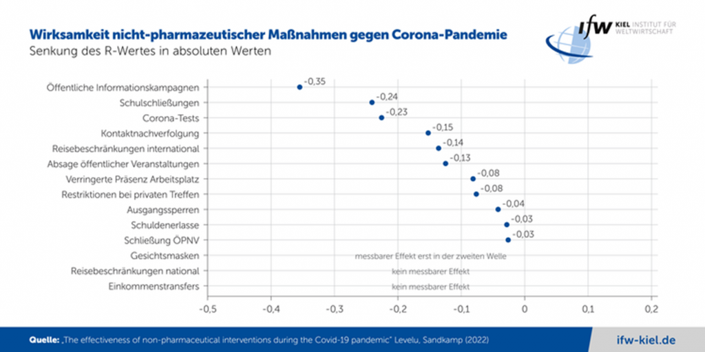 Informationskampagnen senkten die Reproduktionszahl – den sogenannten R-Wert –, also die Anzahl an Menschen, die eine infizierte Person im Durchschnitt ansteckt, um 0,35, Schulschließungen um 0,24. “Gleichwohl folgt aus der hohen Wirksamkeit einer Maßnahme nicht automatisch eine Empfehlung zur politischen Umsetzung, wenn wie im Fall von Schulschließungen die negativen Folgen stark sind”, sagte Studienautor Alexander Sandkamp vom IfW Kiel. Welche negativen Folgen er konkret damit meint, erklärte er nicht.
