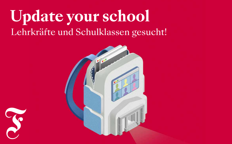 Mit dem „DigitalPakt Schule“ unterstützt der Bund die Länder und Gemeinden bei Investitionen in die digitale Bildungsinfrastruktur. Schülerinnen und Schüler erhalten nun im Rahmen des F.A.Z.-Bildungsprojekts “Update your school” die Möglichkeit, ihre Vision des Lernens in einer digitalen Welt nach ihren Bedürfnissen und Vorstellungen zu entwickeln und so eine optimale Lernumgebung zu schaffen. Das Projekt wird von der Google News Initiative unterstützt.