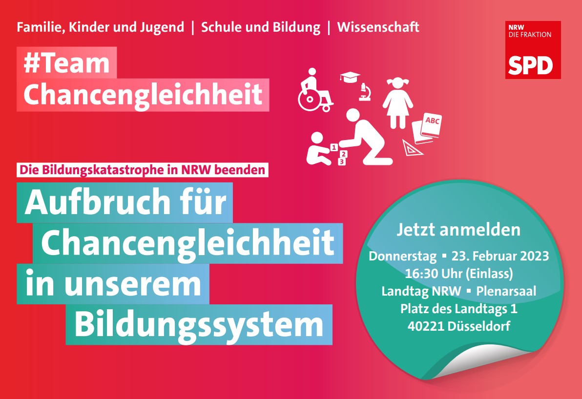Chancengleichheit ist ein Mega-Thema. Weil sie nicht herrscht. Stattdessen befindet sich NRW mitten in einer Bildungskatastrophe. Die SPD-Fraktion im Landtag NRW lädt deshalb für den 23. Februar Bildungsakteure und Interessierte zu einem LandtagsTalk nach Düsseldorf ein, um gemeinsam mit Vertreter*innen aus Politik, Wissenschaft und Praxis über Lösungswege zu diskutieren.