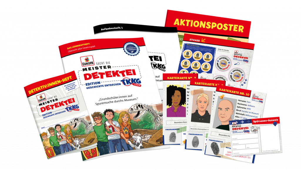Unterricht mal anders! Mit der Aktion „EUROPA sucht die Meister-Detektei“ löst Ihre Klasse gemeinsam mit TKKG Junior knifflige Fälle und lernt dabei, wie spannend Geschichte sein kann. Relevantes Grundschulwissen wird curriculumsnah in bis zu vier Kriminalfälle verpackt, so lernen die Kinder mit Spaß das Alte Ägypten, die Römer, das Mittelalter und die Steinzeit kennen. Mit Hörspieltracks und vier Aufgabenheften, die einzeln und/oder kombinierbar im Unterricht anwendbar sind. Bestellen Sie Ihr Print-Paket (solange der Vorrat reicht) oder laden Sie sich alle Informationen und Schulmaterialien ganz einfach digital als PDF kostenlos herunter: www.meister-detektei.de