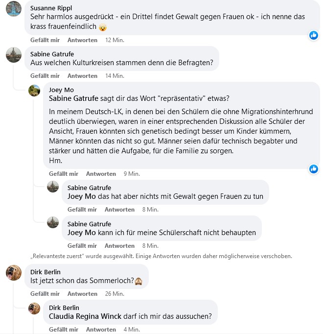werden” Besonders gravierend seien die Aussagen über Gewalt gegen Frauen, die bei den befragten Männern eine beachtliche Akzeptanz erfahre. News4teachers