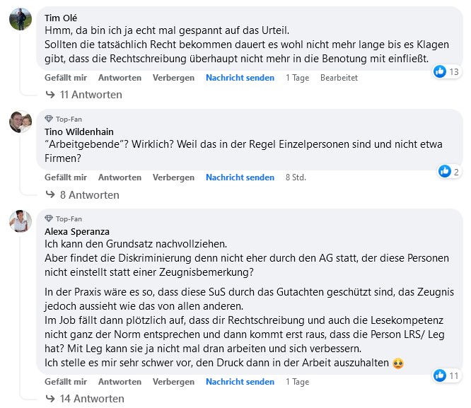 Ich habe eine LRS die in den 90/00er Jahren niemand interessiert hat. Da hieß es von meinen Eltern und den Lehrern an der Grundschule/Gymnasium noch “streng dich einfach mehr an”, getestet wird sowas auf den flachen Land in Bayern nicht und von Nachteilsausgleichen konnte man nur träumen. Meine schulische Laufbahn war deshalb holpriger (runter vom Gymnasium wegen Deutsch/Englisch 5, sonst nur 1er und 2er) und 8. Klasse Realschule wiederholen (mit einen Notendurchschnitt von 2,1, aber wieder Englisch/Deutsch: 5). In der 9ten und 10ten Klasse hatte ich dann endlich eine 2 in Deutsch (da Rechtschreibung ab da an nur noch 1/5 der Note ausmachte) und eine 4 in Englisch, sonst wieder nur 1 und 2er… Hat mir gar nichts gebracht, dass auf meinen Abschlusszeugnis, wegen des nicht gegebenen Nachteilsausgleich, nichts von der LRS stand. Denn ich absolvierte danach eine schulische Ausbildung zur Erzieherin und studierte im Anschluss Pädagogik an der Uni. Potenzielle Arbeitgeber wollen von mir seit Jahren nur mein Ausbildungs-/Bachelor-/Masterzeugnis sehen und meine Arbeitszeugnisse.