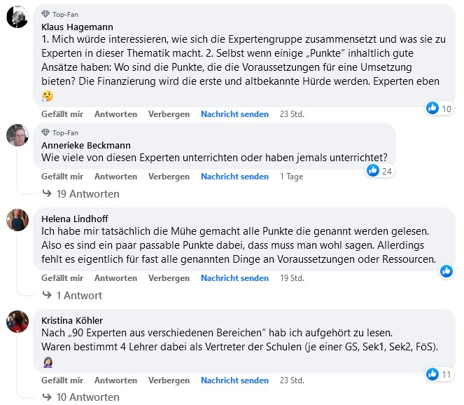 Selbst für mich als Nicht-Lehrer klingt das nach hohler Phrasendrescherei. Wer sind denn bitte immer diese Experten, die hier zu Rate gezogen werden? Die echten Experten sitzen doch täglich an der Front im Klassenzimmer und wissen wohl am besten, was Schülerinnen und Schüler brauchen. Stattdessen schleudern irgendwelche Universitätsangestellte ihre Vorschläge aus dem Elfenbeinturm heraus.