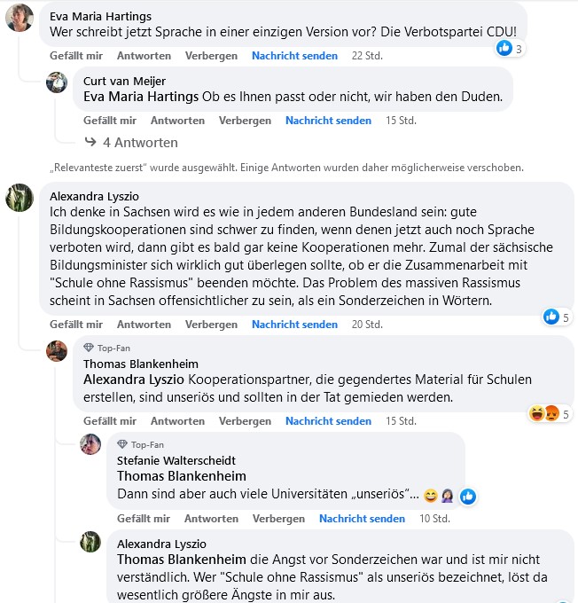 Also ich bin beeindruckt: wenn die Tatsache, dass über Kooperationspartner das Gendersternchen in die Schulen schwappen könnte, ein so dringendes Problem darstellt, dass der sächsische Bildungsminister extra eine Handreichung dazu verfassen lässt – sprich, Ressourcen dazu aufwendet -, muss es um die Schulen in Sachsen ja richtig gut bestellt sein. Ansonsten würde man ja alle Manpower in die Suche nach Lehrkräften, die Ausstattung der Schulen, Schulentwicklung usw. stecken. Ist doch so, oder? ODER ???
