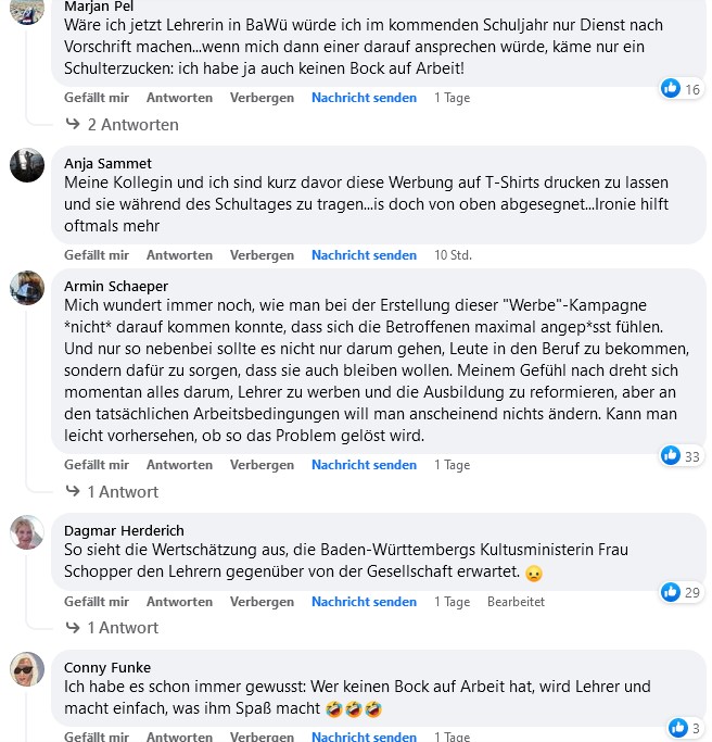 “Mir geht es ziemlich auf den Senkel, dass alles, aber auch wirklich ALLES als Kritik und Unverschämtheit aufgefasst wird. Dieses Beleidigtsein trägt meines Erachtens deutlich mehr zum Lehrerimage bei als ein mehrdeutiges, provokantes Werbeplakat.”
