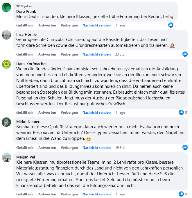 Die Reaktion von Bildungssenatorin (und KMK-Präsidentin) Katharina Günther-Wünsch (CDU): eine „Qualitätsstrategie“ anzukündigen, deren Grundzüge allerdings noch im Dunklen liegen. „Die Steigerung der Bildungsqualität, das Erreichen von Regelstandards bei den Vergleichsarbeiten in den Jahrgangsstufen 3 und 8 sowie der Erwerb grundlegender Fertigkeiten im Lesen, Schreiben und Rechnen bereits in den ersten Grundschuljahren für möglichst alle Schülerinnen und Schüler müssen das oberste bildungspolitische Ziel in Berlin werden“, so verlautete sie. „Denn sprachliche und mathematische Kompetenzen sind, neben sozial-emotionalen Kompetenzen, zentrale Voraussetzungen für den schulischen Erfolg, das Weiterlernen in der beruflichen Bildung und die Teilhabe am gesellschaftlichen Leben.“