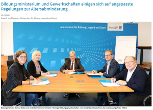 In der Pressemitteilung des Ministeriums liest sich das Ergebnis der Gespräche dann so: „Thüringer Lehrerinnen und Lehrer können sich langfristig und nachvollziehbar auf angepasste Regelungen zur sogenannten Altersabminderung einstellen. Thüringens Minister für Bildung, Jugend und Sport, Helmut Holter, und Vertreterinnen und Vertreter Thüringer Bildungsgewerkschaften und -verbände haben am 19. Oktober 2023 Einigung bezüglich einer Neuregelung von Altersabminderungen von Lehrkräften an Staatlichen Schulen im Freistaat erzielt. Änderungen sollen demnach mit einer Stichtagsregelung greifen und für Lehrkräfte ab Geburtsjahrgang 1973 gelten. Für Lehrkräfte früherer Geburtsjahrgänge bleibt es bei den bisherigen Regeln.“