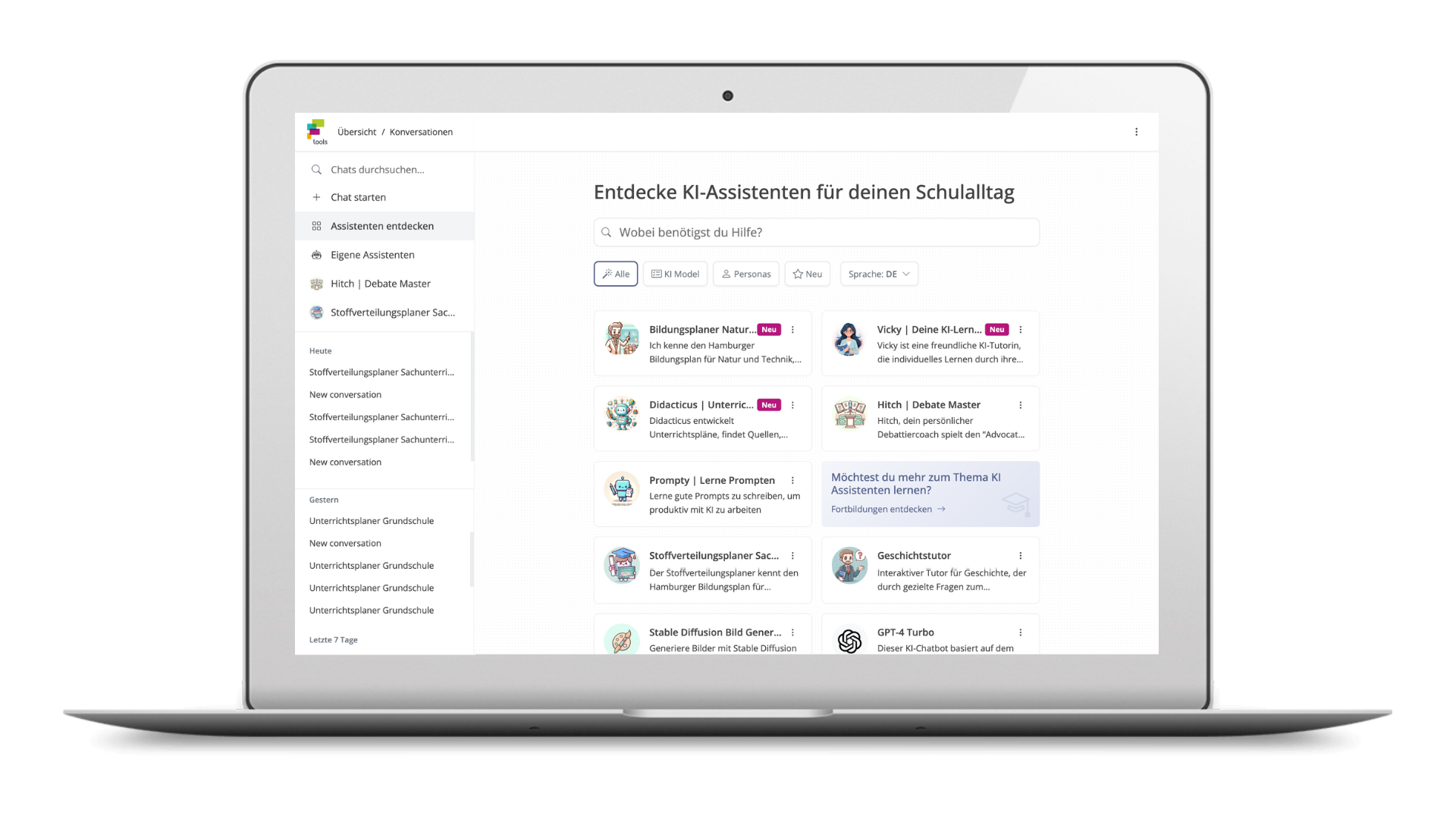 - Didacticus | Unterrichtsplaner & Materialassistent: Didacticus entwickelt Unterrichtspläne, findet Quellen und begleitet die Nutzer:innen durch den Prozess der Unterrichtsvorbereitung und Materialerstellung.