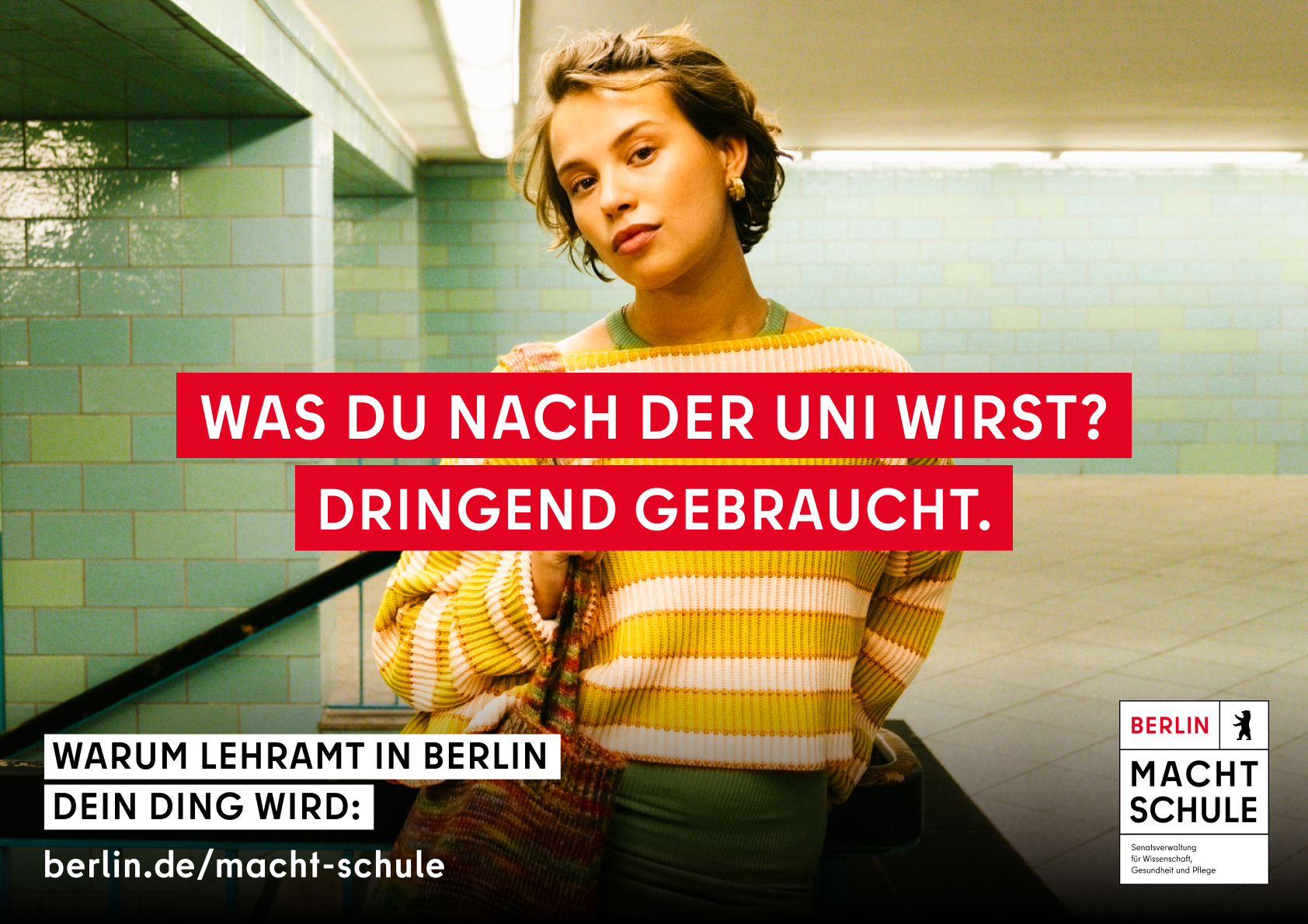 Die Kampagne «Berlin macht Schule» umfasst unter anderem digitale Plakatwerbung in ganz Berlin und in der U-Bahn, Spots im Radio, Social Media-Aktionen und eine Webseite mit vielen Informationen rund um ein Lehramtsstudium. Auch ein Kunst-Projekt gehört dazu: Ein Künstler und eine Künstlerin wurden beauftragt, an zwei Berliner Gymnasien Toilettenräume zu gestalten, «um Schülerinnen und Schüler direkt zu erreichen», wie es heißt. Die Kosten der auf mehrere Jahre angelegten Kampagne betragen jährlich 500.000 Euro.