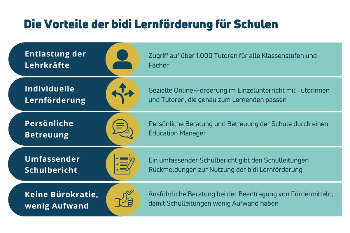 Und das Beste daran: Schulen müssen sich weder um bürokratische noch finanzielle Hürden Gedanken machen. Denn die bidi Bildung Digital GmbH nimmt sie bei der Einführung der bidi Online-Nachhilfe Schritt für Schritt an die Hand.