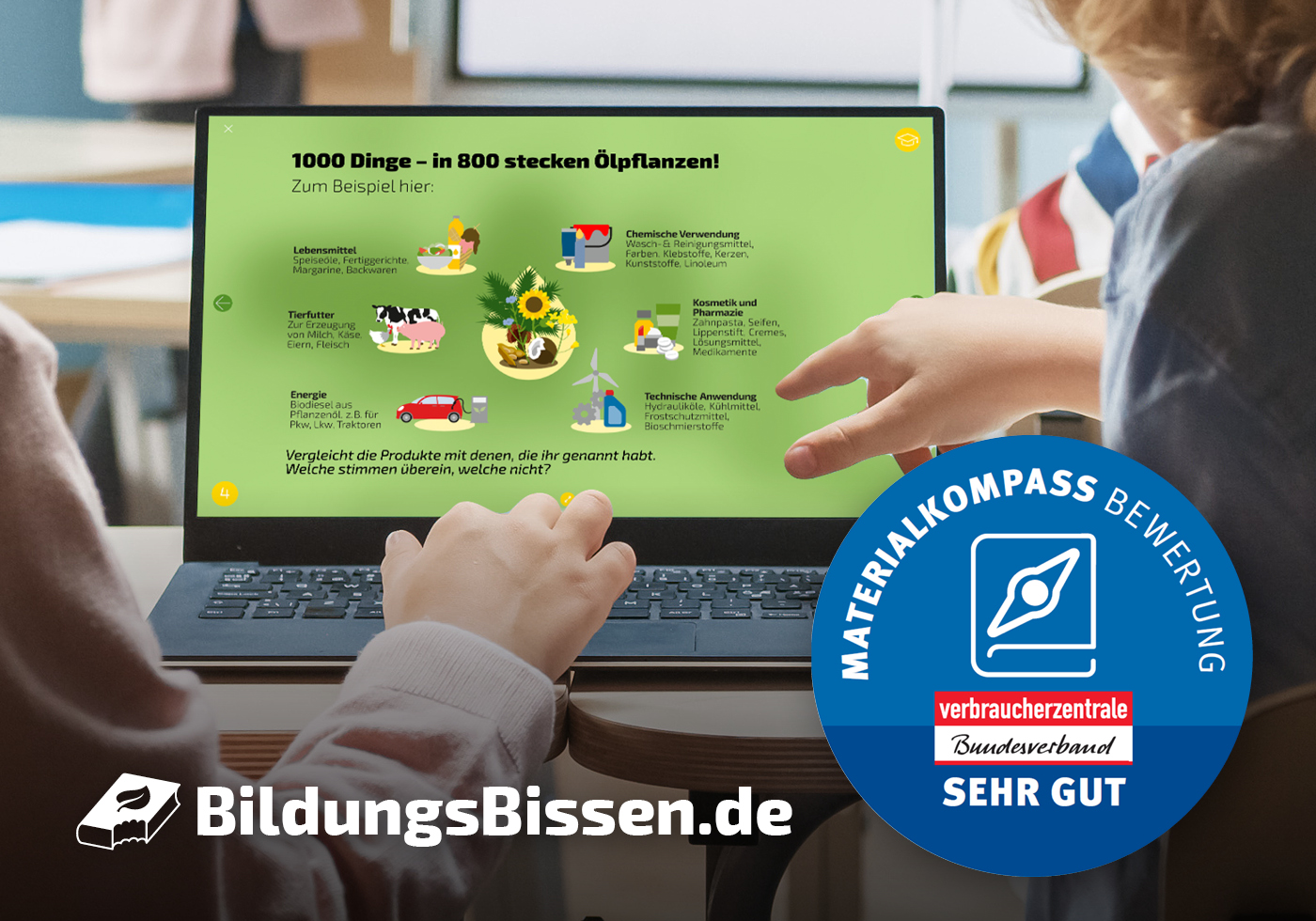 Das neue Lernportal BildungsBissen.de hat die Prüfung des „Materialkompass Verbraucherbildung“ mit Bravour bestanden. Das Ergebnis: herausragende Bewertungen für Inhalt, Didaktik und Gestaltung! Mit interaktiven, faktenbasierten und lehrplanrelevanten Inhalten wecken die BildungsBissen das Interesse von Kindern und Jugendlichen und fördern die kritische Auseinandersetzung mit Pflanzen als nachwachsender Ressource.
