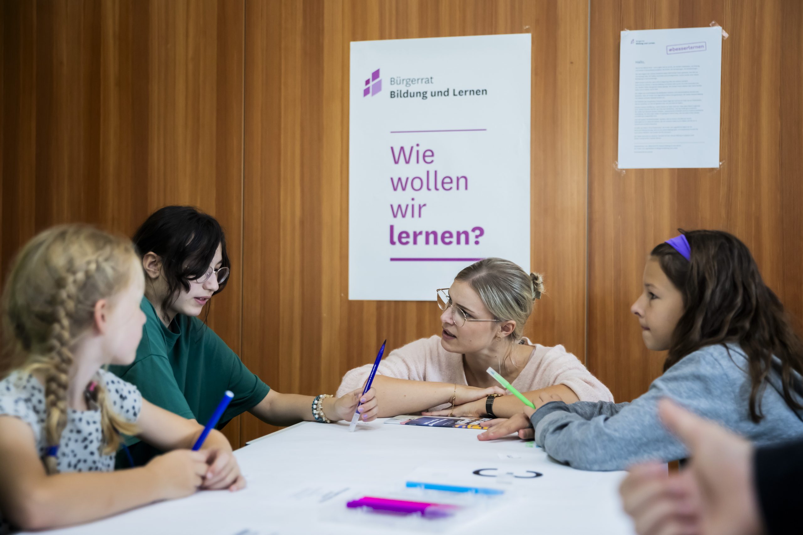 Am nächsten Tag wird fleißig weiter diskutiert auf dem Bildungscampus Nord in Köln. Diesmal sitzen nicht nur Schülerinnen und Schüler zusammen, sondern rund 100 Menschen jeden Alters aus ganz Deutschland. Das Ziel der zweitägigen Sitzung ist es, sich im Dialog auf Augenhöhe über Bildungsthemen auszutauschen. Der Bürgerrat Bildung und Lernen wurde bereits 2020 von der Montag Stiftung Denkwerkstatt ins Leben gerufen und soll nicht nur Probleme im Bereich Bildung benennen, sondern Lösungsansätze erarbeiten. 2023 wurde ein erster Katalog mit Empfehlungen aus Bürgersicht an die Kultusministerkonferenz übergeben. Im Bürgerrat Bildung und Lernen können Jugendliche unter 16 Jahren mitarbeiten. Das ist bundesweit einzigartig. Es sollen auch diejenigen im Bürgerrat zu Wort kommen, die täglich zur Schule gehen und dort lernen, heißt es.