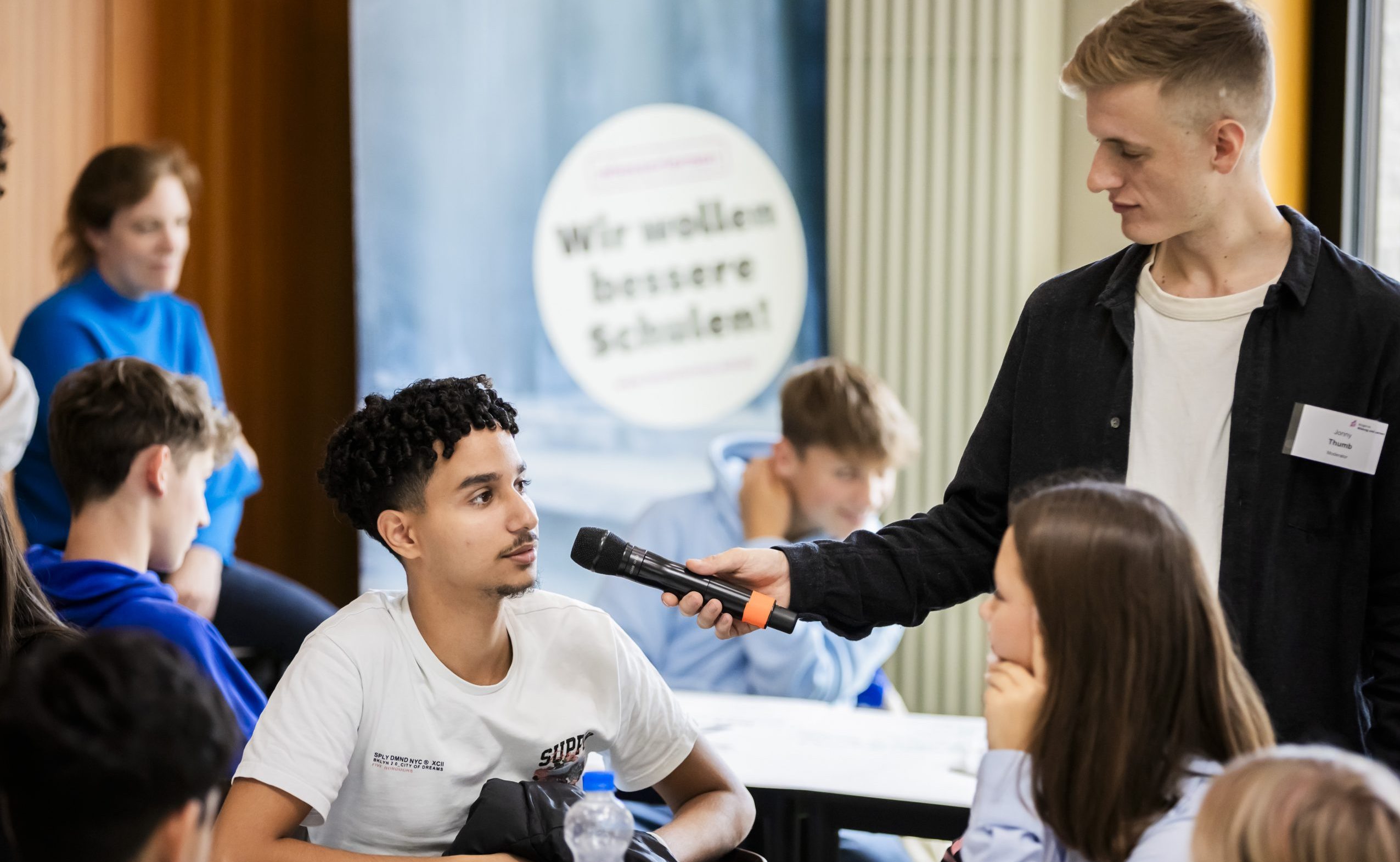 Etwa 100 Schülerinnen und Schüler sitzen an Tischen und diskutieren. Gerade steht das Thema späterer Unterrichtsbeginn auf der Tagesordnung. Die Argumente gehen hin und her. Beginnt die Schule morgens später, kommen die Schülerinnen und Schüler nachmittags auch erst später wieder nach Hause. Aber für die Kinder und Jugendlichen überwiegen die Vorteile: „Es ist doch bewiesen, dass man sich einfach besser konzentriert, wenn Schule um 9 Uhr starten würde“, meint ein Junge – und erntet Beifall.
