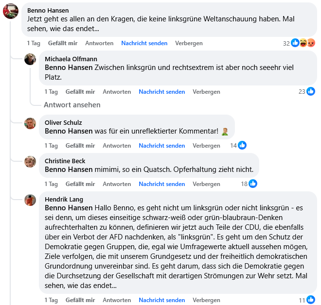 Irgendwie kann ich Ihnen nicht folgen, … Wer soll denn nun was und wie überprüfen? Vielleicht könnten Sie ja mal konkret schreiben, wie Sie sich das vorstellen/wünschen. Wollen Sie auch mehr Befugnisse für die Sicherheitsorgane wie zu Zeiten des Radikalenerlasss und wie die AfD jetzt, oder Zustände wie in China oder Denunzianten oder was ganz anderes? Ihre Kommentare diesbezüglich sind sehr wirr (jedenfalls für mich nicht verständlich).