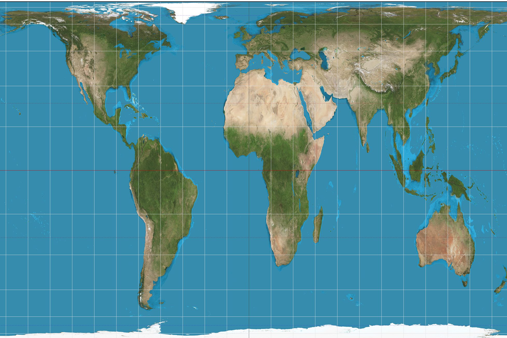 Daher wird die Fläche immer größer, je weiter man vom Äquator entfernt ist, äquatornahe Regionen – Afrika, Südamerika und Südasien – werden dagegen viel kleiner dargestellt. Somit wirken dort große Länder wie etwa Indonesien, Brasilien, Kolumbien, die Demokratische Republik Kongo und Kenia viel kleiner als sie im Vergleich zum Rest der Welt sind. Polnahe Regionen wie Kanada, Russland, Skandinavien und vor allem Grönland und die Antarktis erscheinen hingegen viel zu groß.