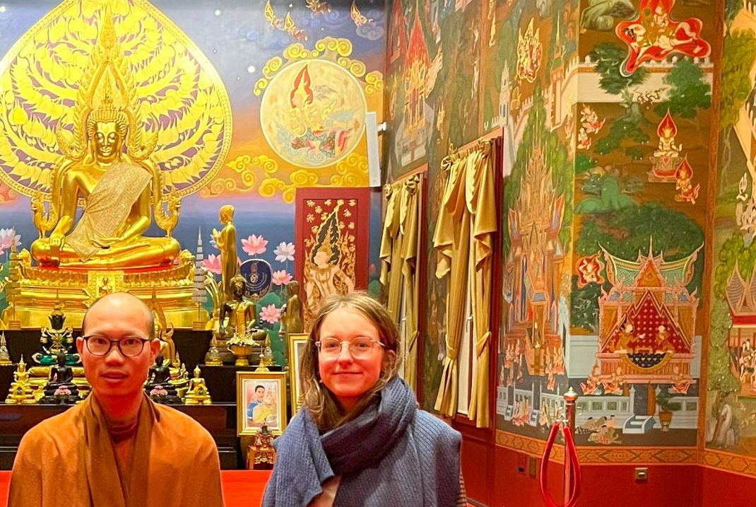 Der virtuelle Rundgang durch den buddhistischen Tempel entstand im Rahmen einer Bachelorarbeit. Verfasst wurde sie von Vivienne Adolphs, Lehramtsstudentin für Religion und Geschichte. Für sie bedeutete das Projekt gleich mehrere Herausforderungen: den Umgang mit der 360-Grad-Technik, die inhaltliche Auseinandersetzung mit buddhistischer Lehre sowie Gespräche mit den Mönchen vor Ort und schließlich die didaktische Aufbereitung für Schule und Hochschule. Entstanden ist ein Rundgang, der nicht nur Räume erschließt, sondern Hintergrundwissen vermittelt, Mönche zu Wort kommen lässt, Meditationssequenzen enthält und mit Quiz-Elementen sowie Zusatzmaterialien für Lehrkräfte arbeitet. Ein Avatar begleitet die Lernenden durch den Tempel.