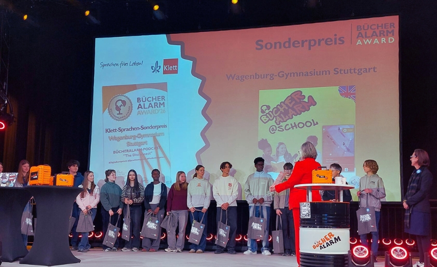 Besonders hervorgehoben wurde der Fremdsprachensonderpreis, der von Ernst Klett Sprachen und BÜCHERALARM ausgelobt wurde. Die Klasse 9b des Wagenburg-Gymnasiums Stuttgart erhielt die Auszeichnung für ihren englischsprachigen Podcast zu „The Disconnect“ von Keren David. In ihrer Laudatio hob Tamara Ziegler, Leiterin des Bereichs Marketing Schule bei Ernst Klett Sprachen, hervor, wie die Klasse die unterschiedlichen Aspekte des Buches vertieft, verständlich aufbereitet und für die Zuhörerinnen und Zuhörer greifbar gemacht hat – und das alles in einer Fremdsprache. Mit ihrer Podcast-Folge ermutigt die Klasse zudem viele andere Schülerinnen und Schüler, sich der Herausforderung zu stellen, selbst einen Podcast in einer Fremdsprache zu produzieren.