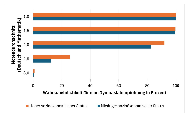 Im Durchschnitt erhielten 43,3 Prozent der Kinder eine Empfehlung für das Gymnasium. Die Unterschiede nach sozialer Herkunft fallen jedoch deutlich aus. Für ein Kind mit mindestens einem Elternteil, der einen hochqualifizierten akademischen Beruf ausübt – etwa als Architektin, Unternehmensberater oder Wissenschaftlerin –, lag die Wahrscheinlichkeit einer Gymnasialempfehlung bei 64,5 Prozent. Für Kinder, deren Eltern einer einfachen Facharbeit nachgehen, etwa im Einzelhandel, in der Lagerarbeit oder in der Gebäudereinigung, betrug sie dagegen lediglich 22,6 Prozent.