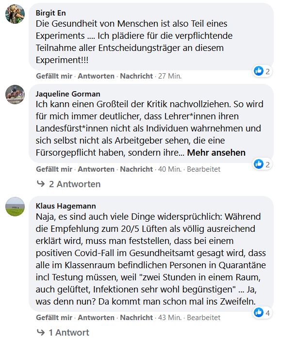 Wenn das Kultusministerium uns Eltern schon zwingt unsere Kinder in der Pandemie in die Schule zu schicken, dann sollten die gefälligst auch dafür die Voraussetzungen schaffen. Das passiert nicht, im Gegenteil es werden Tatsachen und eindringliche Warnungen verdreht dargestellt oder erst gar nicht erwähnt.